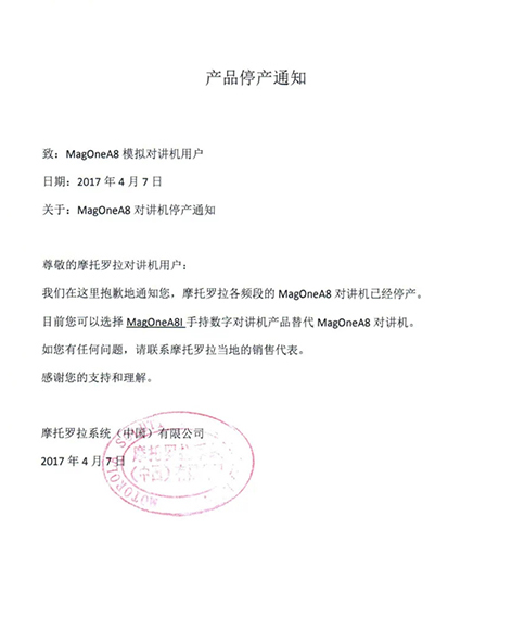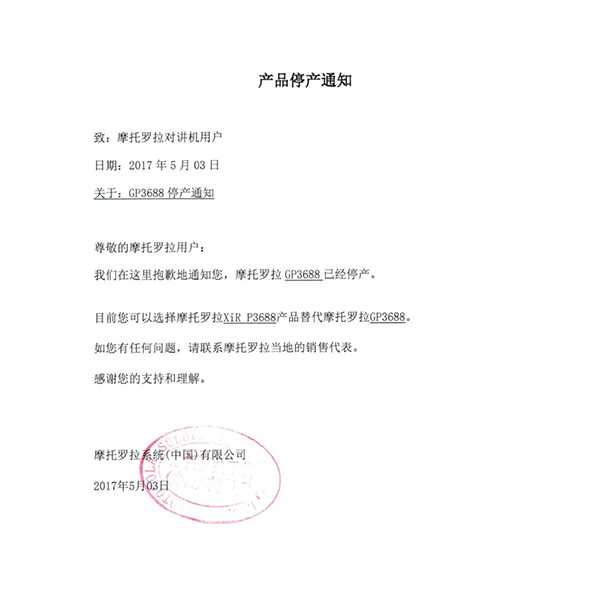 摩托羅拉系統(tǒng)根據(jù)國(guó)家相關(guān)要求,已于2015年逐步停止了模擬機(jī)全球工廠的生產(chǎn),同時(shí)按照國(guó)家有關(guān)規(guī)定,相關(guān)機(jī)型的《無(wú)線電發(fā)射設(shè)備型號(hào)核準(zhǔn)證》及《防爆電氣設(shè)備防爆合格證》均已不再辦理延期手續(xù)。